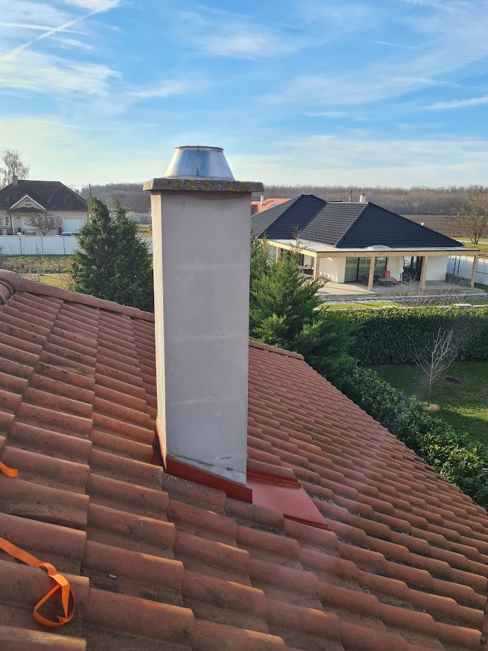 A képen látható kémény a már meglévő gallérral beázott. A kémény oldalsó lemezelésével, valamint a beton fedlap beburkolásával a probléma megszűnt.