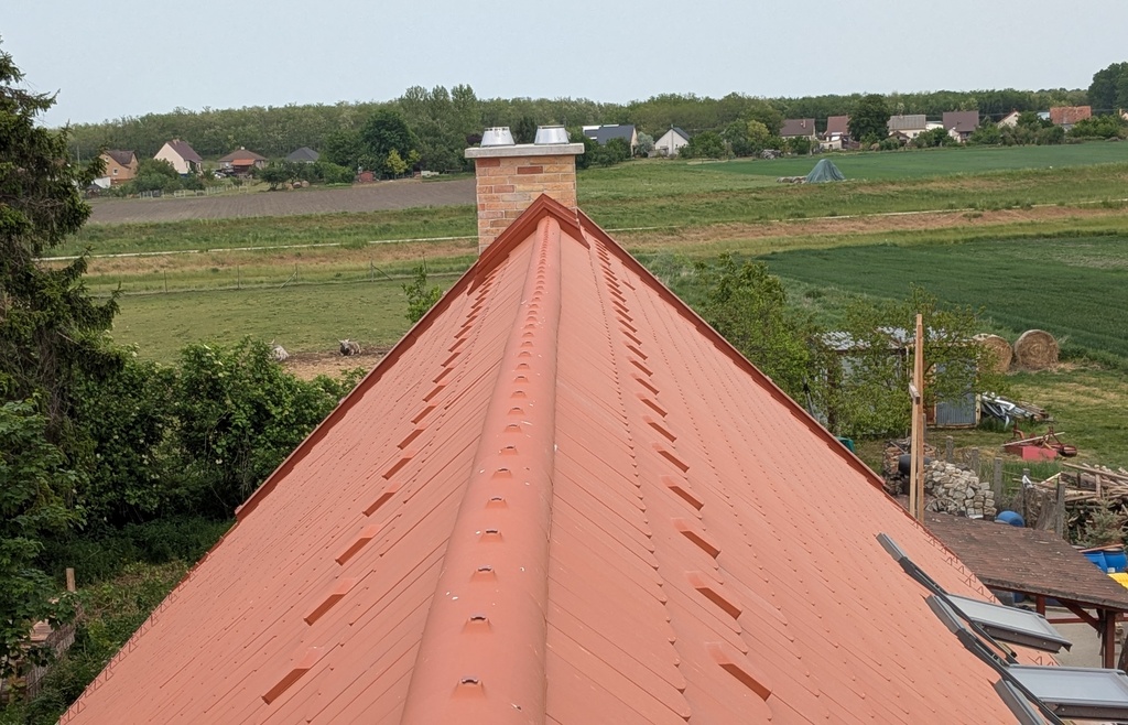 Ház oromzatainak fedése, ereszcsatornázása, kémény szegélyezése.